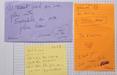 Dans le premier groupe, les participants ont noté sur des post-it des pensées bienveillantes, comme s’ils s’adressaient à un ami : les messages étaient destinés à eux ou à une autre personne du groupe; chacun est reparti avec de petits mots chaleureux à afficher sur son frigo… ou ailleurs, pour garder le sourire.